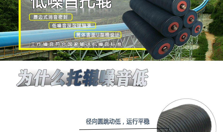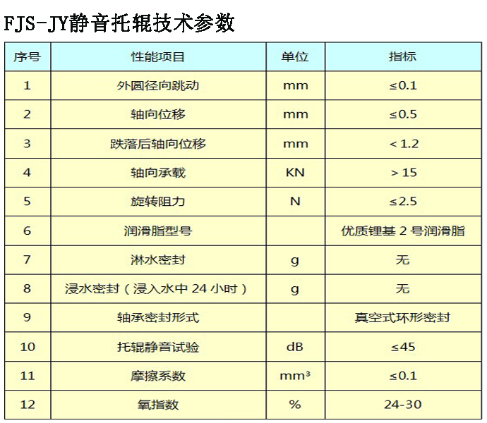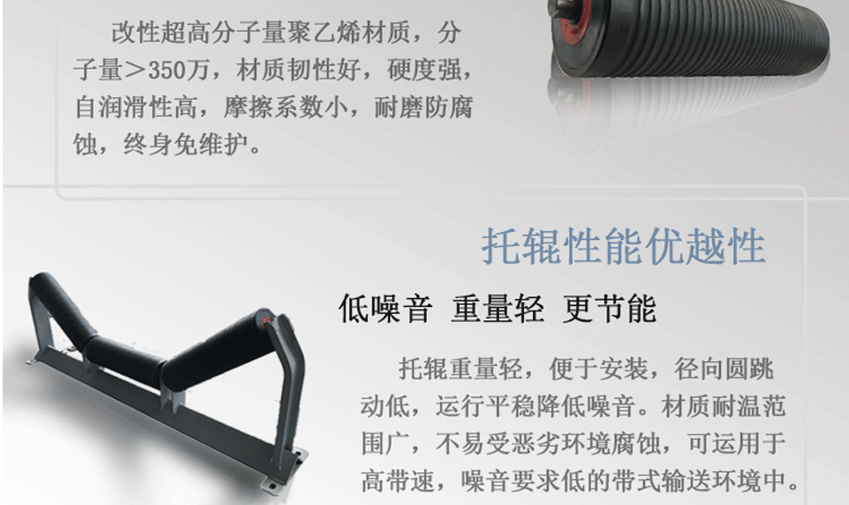 產(chǎn)品簡介: FJS-JY低噪音托輥,其管體選用優(yōu)質(zhì)改性超高分子量聚乙烯(UHMW-PE)主材料,通過良好的生產(chǎn)加工工藝,使動(dòng)平衡等級達(dá)到G16(ISO1940)標(biāo)準(zhǔn),運(yùn)行平穩(wěn),U型通風(fēng)槽精細(xì)加工,減少與皮帶的摩擦。結(jié)合華北塑料公司自主研發(fā)的唇邊式消音密封,使帶式輸送機(jī)的噪音降到(達(dá)到)國家標(biāo)準(zhǔn)GB12348以下。